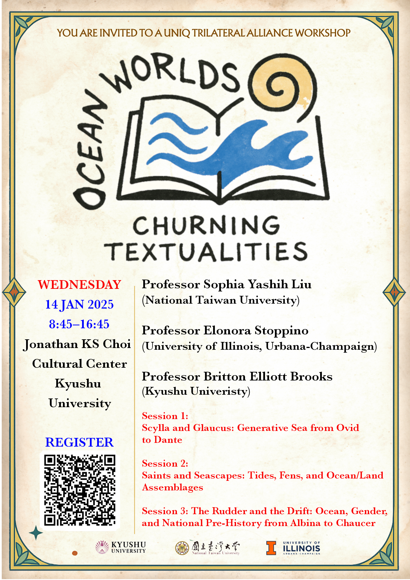 | Event details | Session 1: Prof. Elonora Stoppino (University of Illinois, Urbana-Champaign), 'Scylla and Glaucus: Generative Sea from Ovid to Dante'. Session 2: Prof. Britton Elliott Brooks (Kyushu University), 'Saints and Seascapes: Tides, Fens, and Ocean/Land Assemblages'. Session 3: Prof. Sophia Yashih Liu (National Taiwan University), 'The Rudder and the Drift: Ocean, Gender, and National Pre-History from Albina to Chaucer'. |