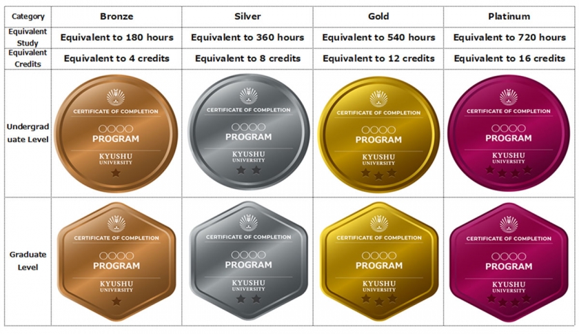 Kyushu University uses a unified design for its Open Badges. The shape differs between undergraduate and graduate levels, and colors indicate the amount of learning time (not difficulty level).