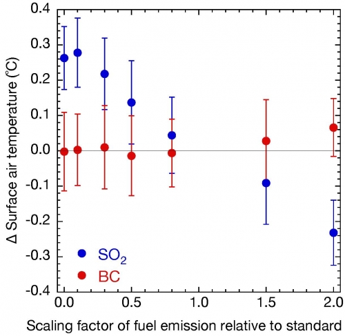 Relationship between the radiative forcing and changes in the surface air temperature for sulfate and black carbon.