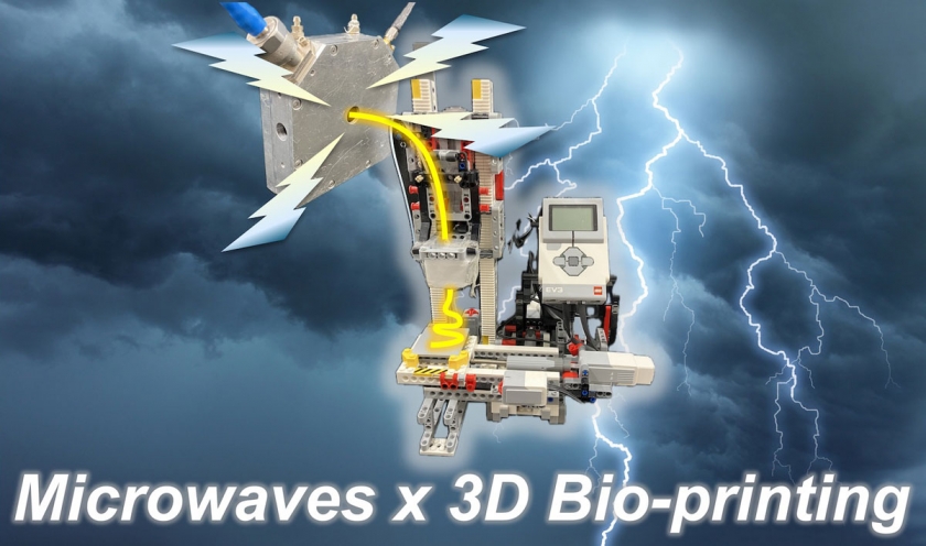 Fig. 1. The 3D bioprinter with microwave emitter. A graphic of the 3D bioprinter powered by Lego Mindstorms EV3 and radiofrequency microwave heating. (Kyushu University/Shuntaro Tsubaki)