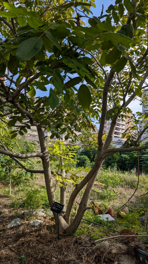 Fig. 1. The Manchurian walnut tree (Juglans mandshurica Maxim.) in Kyushu University's herbal garden. Researchers studied its leaf extracts in their search for eco-friendly herbicides.