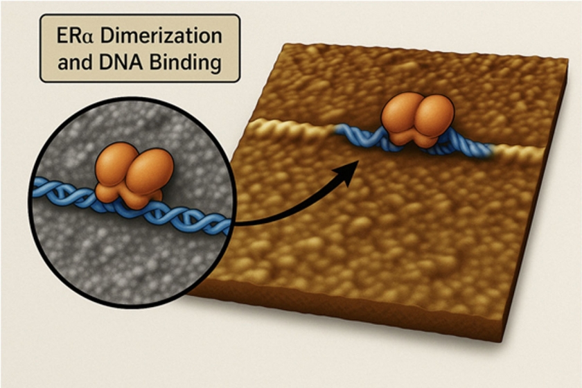 Using high-speed atomic force microscopy (HS-AFM), researchers directly visualized how the estrogen receptor alpha (ERα) binds to DNA and switches on genes in response to the hormone estrogen. Their findings, published in ACS Nano, reveal new molecular details of hormone signaling, with important implications for diseases like breast cancer.