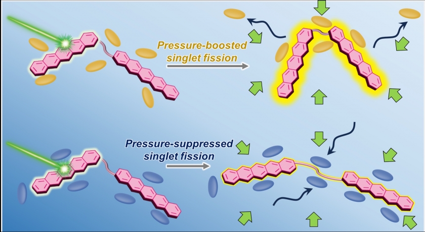 The researchers synthesized a series of SF-active molecules composed of two pentacene (a compound made of 5 fused benzene rings) units connected by flexible polar linkers—molecular chains that act like adjustable bridges between the units. They then examined how these molecules behave under different pressure conditions and solvent environments.