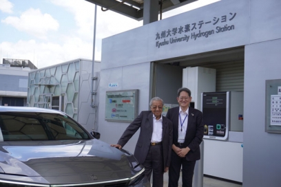 On the morning of the event, Dr. Mahathir toured the International Research Center for Hydrogen Energy. He received an overview from Professor Kazunari Sasaki, Vice President for Research Promotion (Decarbonization) Industry-Academia- Government Collaboration, and Intellectual Property. During the tour, Dr. Mahathir engaged in discussions with Malaysian students, and took a test ride in a hydrogen fuel cell vehicle. A luncheon meeting with President Ishibashi and other university executives was also held, where they exchanged views on future collaboration between Kyushu University and Malaysia in a warm and friendly atmosphere.