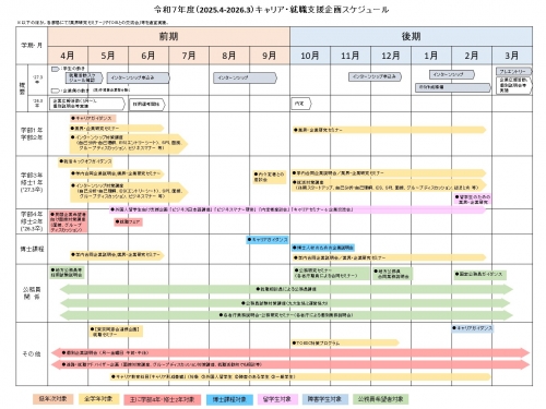 1年を通じてキャリア・奨学支援課ではさまざまな「キャリア・就職支援企画」を開催しています。ここでは、今年度スケジュールを掲載しています。(あくまでも予定ですので、変更になることもあります。予めご了承ください)※追加、変更等適宜更新します。