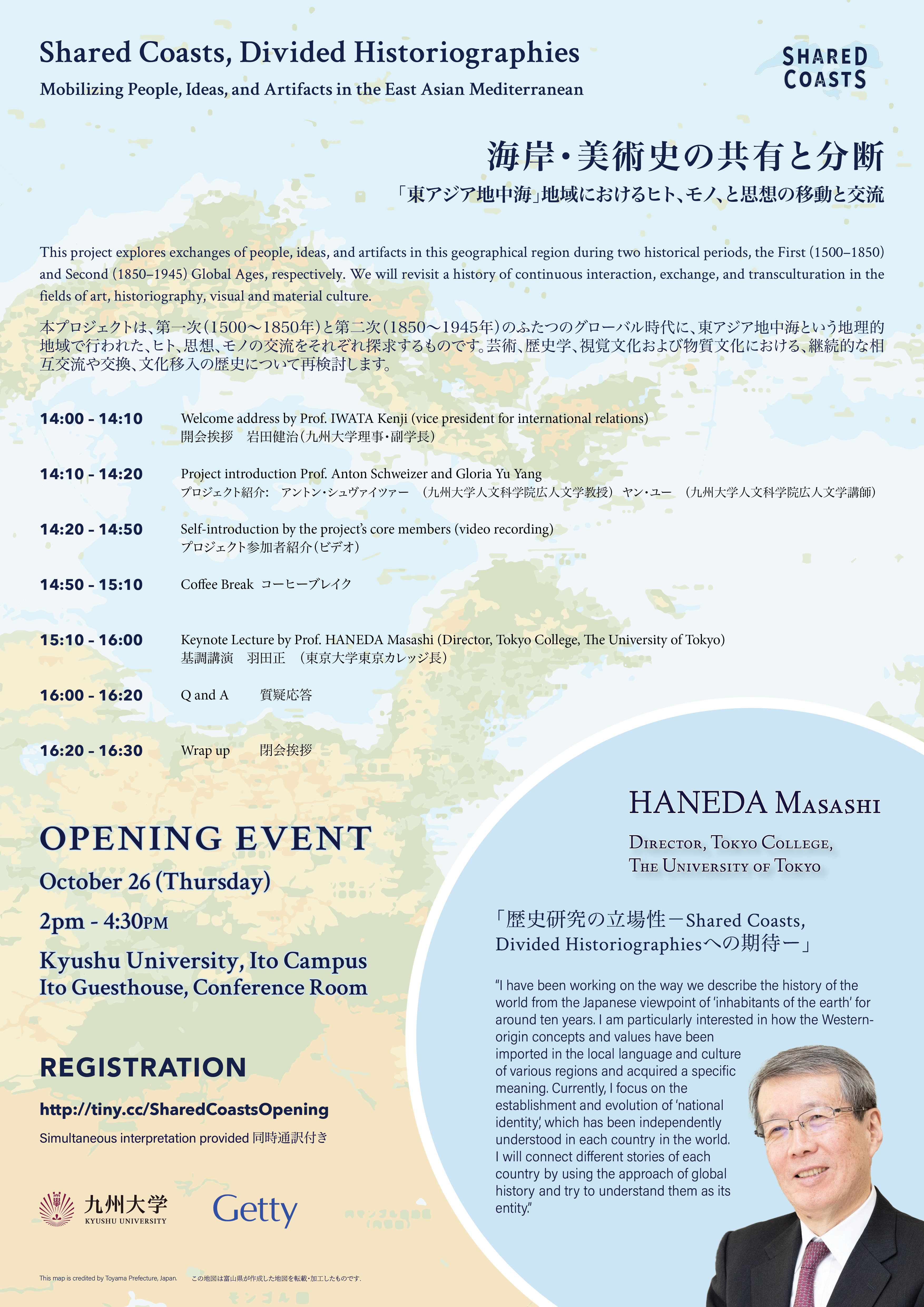 | イベント詳細 | 14:00 – 14:10 開会挨拶 岩田健治(九州大学理事・副学長) 14:10 – 14:20 プロジェクト紹介: アントン・シュヴァイツァー (九州大学人文科学院広人文学教授) ヤン・ユー (九州大学人文科学院広人文学講師) 14:20 – 14:50 プロジェクト参加者紹介(ビデオ) 14:50 – 15:10 コーヒーブレイク 15:10 – 16:00 基調講演 羽田正 (東京大学東京カレッジ長) 16:00 – 16:20 質疑応答 16:20 – 16:30 閉会挨拶 |