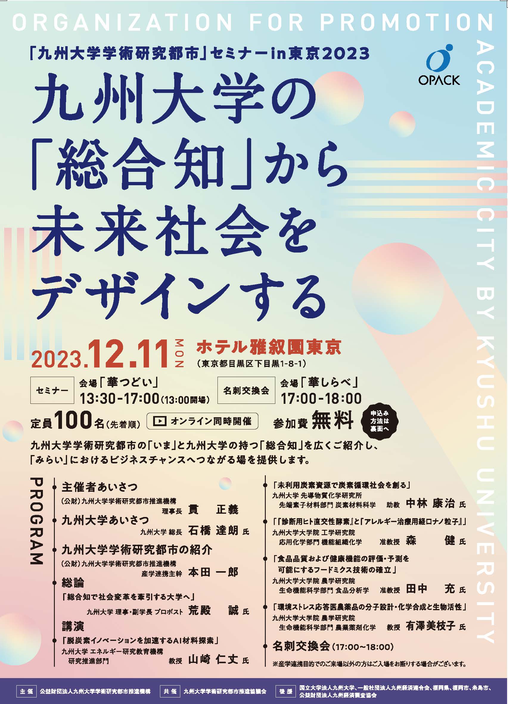 | イベント詳細 | ◆内 容◆ 【セミナー】13:30~17:00 〇主催者あいさつ (公財)九州大学学術研究都市推進機構 理事長 貫 正義 〇九州大学あいさつ 九州大学 総長 石橋 達朗 〇九州大学学術研究都市の紹介 (公財)九州大学学術研究都市推進機構 産学連携主幹 本田 一郎 〇総論 ・「総合知で社会変革を牽引する大学へ」 九州大学 理事・副学長 プロボスト 荒殿 誠 〇講演 ・「脱炭素イノベーションを加速するAI材料探索」 九州大学 エネルギー研究教育機構 研究推進部門 教授 山崎 仁丈 ・「未利用炭素資源で炭素循環社会を創る」 九州大学 先導物質化学研究所 先端素子材料部門 炭素材料科学 助教 中林 康治 ・「『診断用ヒト直交性酵素』と『アレルギー治療用経口ナノ粒子』」 九州大学大学院 工学研究院 応用化学部門 機能組織化学 准教授 森 健 ・「食品品質および健康機能の評価・予測を可能にするフードミクス技術の確立」 九州大学大学院 農学研究院 生命機能科学部門 食品分析学 准教授 田中 充 ・「環境ストレス応答医農薬品の分子設計・化学合成と生物活性」 九州大学大学院 農学研究院 生命機能科学部門 農業薬剤化学 教授 有澤 美枝子 【名刺交換会】17:00~18:00 〔主催〕公益財団法人九州大学学術研究都市推進機構 〔共催〕九州大学学術研究都市推進協議会 〔後援〕国立大学法人九州大学、一般財団法人九州経済連合会、福岡県、福岡市、糸島市、公益財団法人九州経済調査協会 |