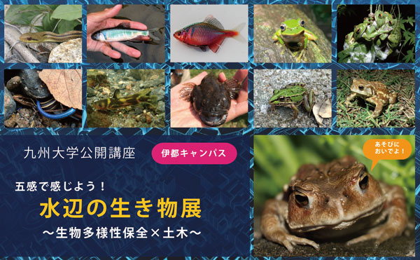 イベント詳細 | 本公開講座では、生物多様性保全×土木をテーマとして、水辺の生き物の水槽展示を行います。近年、持続可能な社会の構築が求められています(SDGs)。それは私たち土木工学の分野でも例外ではなく、自然環境の保全や生物多様性への貢献はとても大切な土木分野のミッションでもあります。本展示では、九大土木教室で取り組むSDGs・ネイチャーポジティブ(生物多様性保全)に関する研究紹介も併せて行います。大人も子供も楽しく体験できるイベントとなっています。当日は、九大祭も開催されています。あわせてお楽しみください。 【開催日時】 11月2日(日)11時~16時 【開催場所】 九州大学伊都キャンパスウエスト2号館3階318号室 【主な内容】 (1)五感で感じよう!水辺の生き物の生体・水槽展示 (2)3Dデジタル生物標本VR体験・3Dプリンターで作成生物模型展示 (3)SDGsに貢献!九大土木教室の研究・活動事例のポスター展示 (4)超精密!顕微鏡で覗いてみよう!生き物のミクロな世界の紹介 (5)環境の専門家と一緒に散策!九大生物多様性保全ゾーンツアー |
