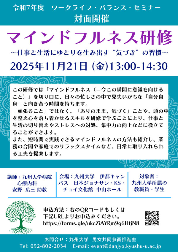 事前申し込みの必要あり [E-mail、Webサイト] ※事前に下記よりお申込みください。 ① Web申込: https://forms.gle/ukcZiAYRm9g6HtjN8 ② E-mail申込: メールタイトルに「11/21ワークライフバランスセミナー」と明記のうえ、お名前、ご所属、連絡先をご記入いただき、下記メールに送付してください。 event@danjyo.kyushu-u.ac.jp (@を半角にして送付してください。) |