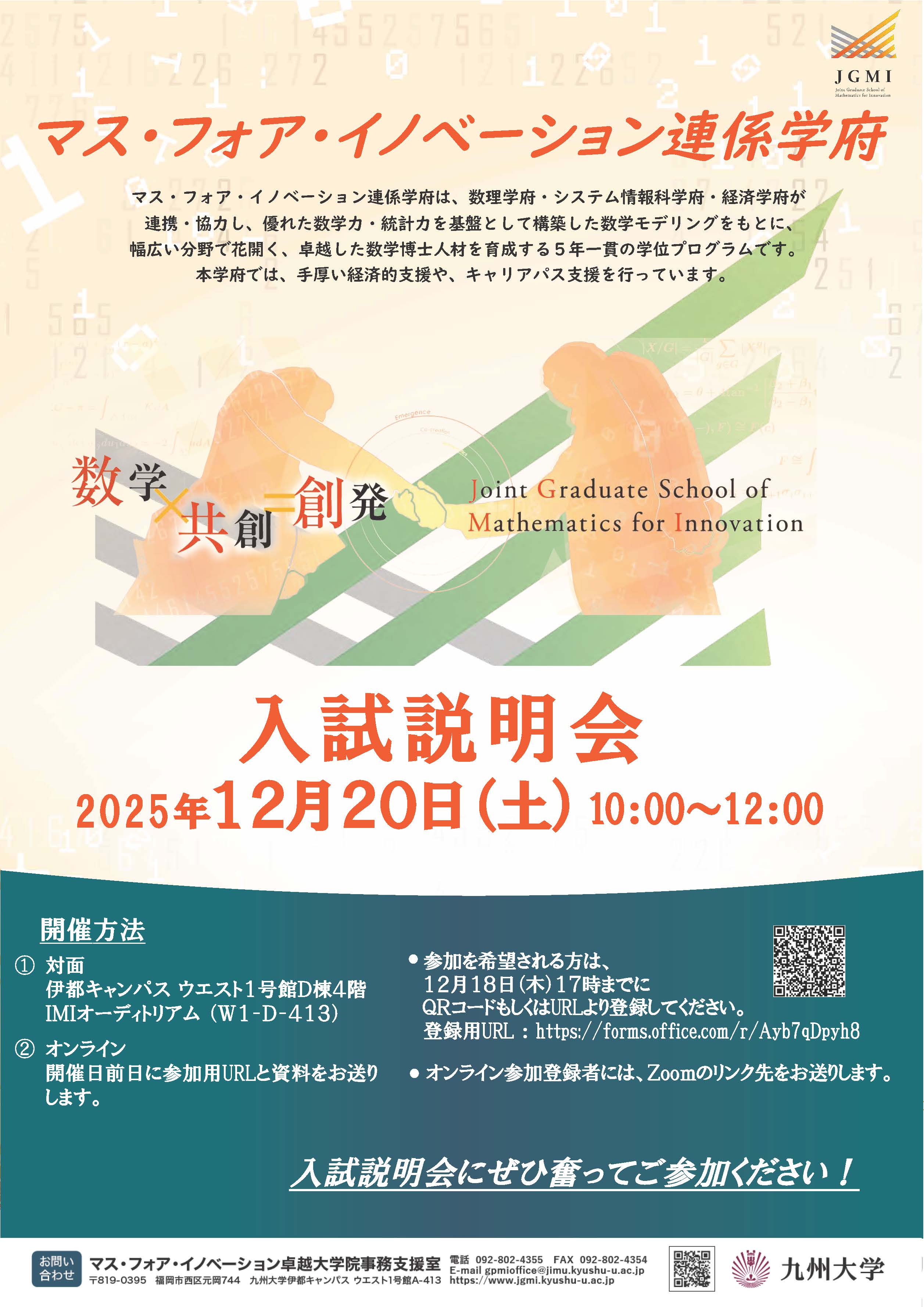 | イベント詳細 | ■九州大学大学院数理学府、大学院システム情報科学府、大学院経済学府(経済工学専攻)いずれかに、令和8年4月1日時点で在籍する予定の学生。 ■「マス・フォア・イノベーション連係学府」に興味のあるすべての皆様 [参加方法] ■ 参加ご希望の方は、12月18日(木)17時までに参加登録をお願いいたします。 登録者に対してZoomのリンク先をお送りいたします。 [登録用URL] https://forms.office.com/r/Ayb7qDpyh8 |