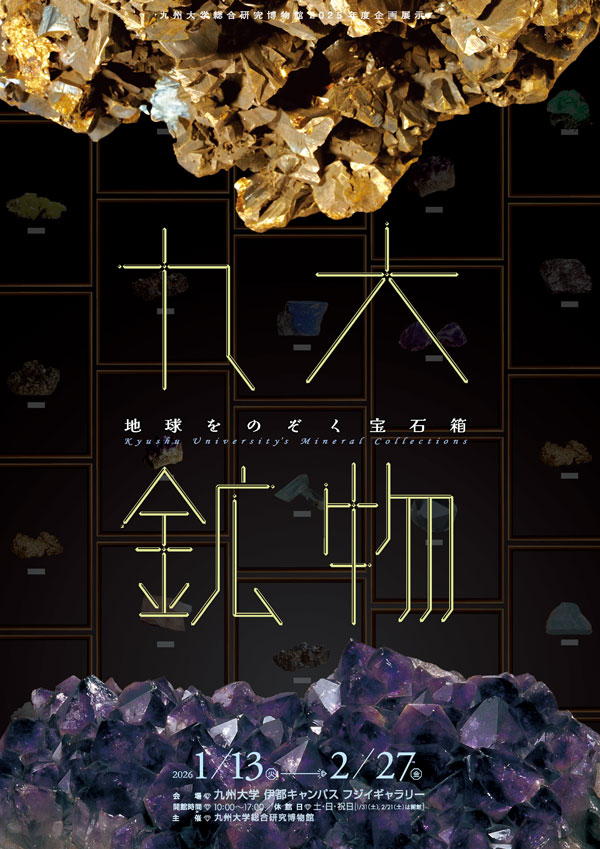 本展では、20世紀初頭の日本三大鉱物標本のひとつに数えられる「高壮吉鉱物標本」をはじめ、福岡県・長崎県産の鉱物を中心に蒐集された「岡本要八郎鉱物標本」、国内外のマンガン鉱物を網羅した「吉村豊文マンガン鉱石標本」など、九大博物館を代表するコレクションを中心に、貴重な鉱物標本群を展示します。美しく輝く鉱物の数々を、ぜひ間近でご覧ください。