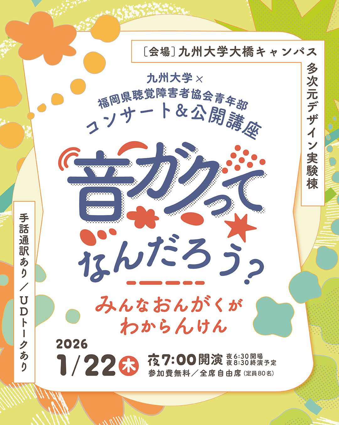 | イベント詳細 | ■出演 <ゲスト講師> 河合拓始(作曲家、ピアニスト) 鈴木玲雄(福岡ろう劇団博多) Sasa-Marie(サイン・ポエット) 「スタジオプロジェクトIV-B(ホールマネジメントエンジニアリングプロジェクト4)」受講生 ほか ■アクセシビリティ 手話通訳:ステージおよび会場内に手話通訳者を手配します。 リアルタイム字幕:ステージでは音声を文字化するアプリ「UDトーク」を活用したリアルタイム字幕を提供します。 その他、当日の配慮についてご要望等がありましたら、可能な範囲で対応いたします。 ーーーーー ■主催:九州大学大学院芸術工学府「スタジオプロジェクトIV-B(ホールマネジメントエンジニアリングプロジェクト4) 」(指導教員:尾本章、長津結一郎、Sasa-Marie) ■共催:社会福祉法人福岡県聴覚障害者協会青年部、九州大学大学院芸術工学研究院附属社会包摂デザイン・イニシアティブ ■後援:福岡市、社会福祉法人福岡県聴覚障害者協会 ■協力:福岡ろう劇団博多、キコエナイ×キコエル発展事業委員会 ■助成:一般財団法人曽田豊二記念財団、科学研究費補助金JP24K03222、JP23K17491 |