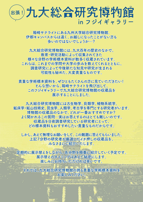 箱崎サテライトを飛び出して、フジイギャラリーで九大総合研究博物館の収蔵品を展示します。