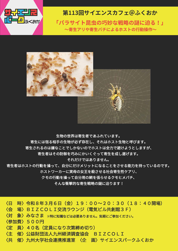| イベント詳細 | 生物の世界は寄生者であふれています。 寄生には宿る相手の生物が必ず存在し、それはホスト生物と呼びます。 寄生されるのは嫌なことでしかないのでホストは全力で避けようとしますが、寄生者はその防御を巧みにかいくぐって寄生を成し遂げます。 それだけではありません。 寄生者はホストの行動を操って、自分にだけメリットになることをさせる能力を持っているのです。 ホストワーカーに実母の女王を殺させる社会寄生性ケアリ、クモの行動を操って自分用の網を張らせるクモヒメバチ、そんな衝撃的な寄生戦略の謎に迫ります! ■髙須賀 圭三 助教(九州大学 大学院理学研究院生物科学部門) |