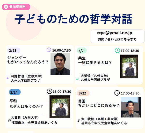 | イベント詳細 | 本イベントは、各回ごとに異なるテーマを設定し、大学教員によるミニレクチャーと参加者による哲学対話を組み合わせて実施します。 各回では、テーマに関連する絵本や具体的な事例を導入として用い、その後、講師による解説や問題提起を行います。続いて、参加者同士で問いを共有し、小グループまたは全体で哲学対話を行います。 【開催日程・内容】 ■ 2月28日(土)16:00–17:30 テーマ:ジェンダー(ちがいってなんだろう?) 会場:九州大学西新プラザ 講師:河野 哲也(立教大学) 対象:小学生から高校生まで(保護者参加可) ■ 3月7日(土)17:00–18:30 テーマ:共生(一緒に生きるとは?) 会場:九州大学西新プラザ 講師:大賀 哲(九州大学) 対象:小学生から高校生まで(保護者参加可) ■ 3月14日(土)16:00–17:30 テーマ:平和(なぜ人は争うのか?) 会場:福岡市立中央児童会館 あいくる 講師:大賀 哲(九州大学) 対象:小学生から高校生まで(保護者参加可) ■ 3月22日(日)17:00–18:30 テーマ:貧困(ちがいはどこにあるか?) 会場:福岡市立中央児童会館 あいくる 講師:大山 貴稔(九州工業大学) 対象:小学生から高校生まで(保護者参加可) すべての回において、専門知識の習得よりも、「問いを立て、考え、他者と対話すること」を重視した参加型プログラムとして実施します。 |
