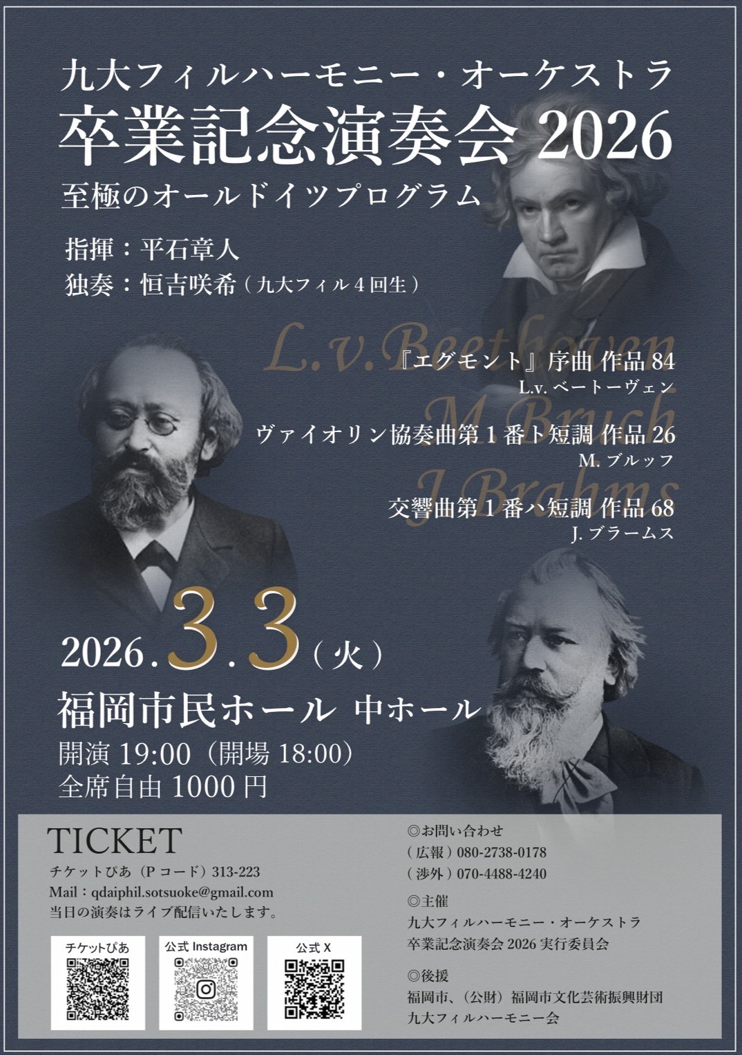 | イベント詳細 | 日時 2026年3月3日(火)開演 19:00(開場 18:00) 会場 福岡市民ホール 中ホール 全席自由 1000円 指揮 平石章人 独奏 恒吉咲希(九大フィル4回生) プログラム ベートーベン 「エグモント」序曲 作品84 ブルッフ ヴァイオリン協奏曲第1番ト短調 作品26 ブラームス 交響曲第1番ハ短調 作品68 |