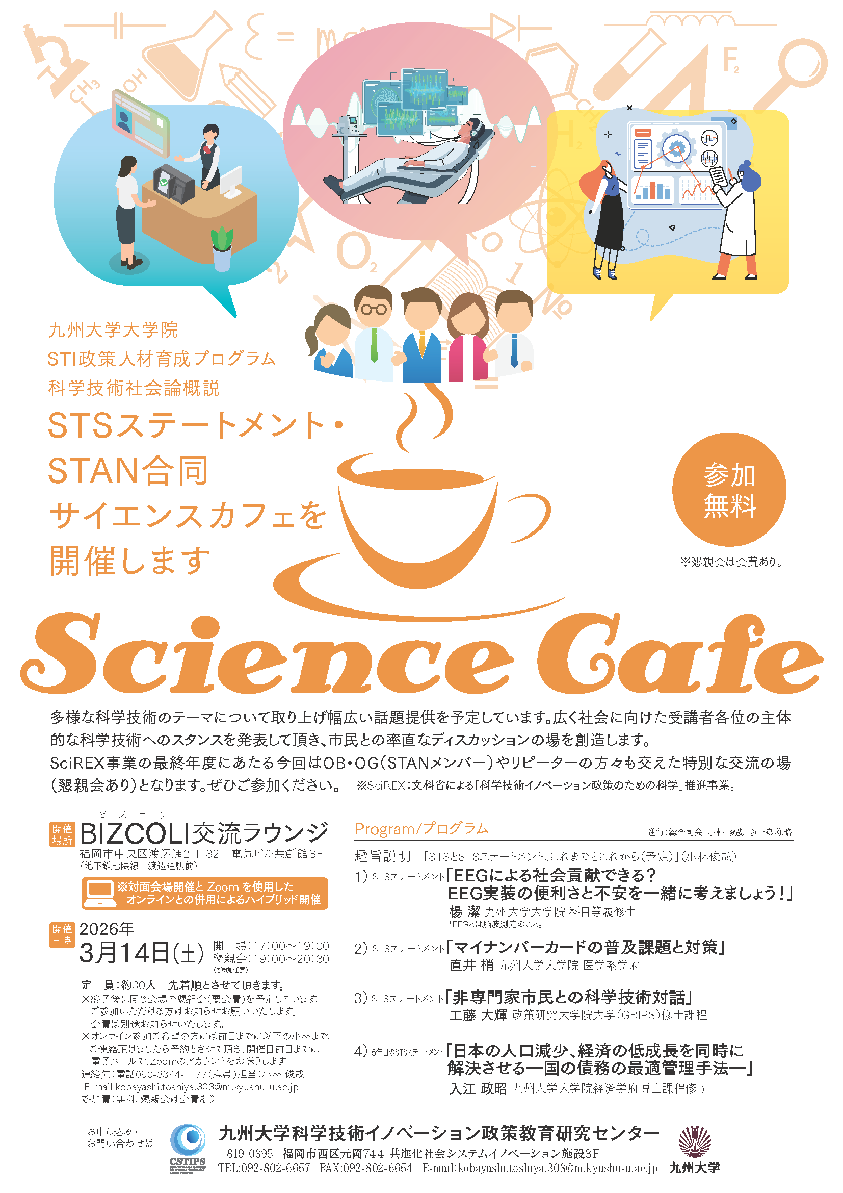 九州大学大学院STI政策人材育成プログラム・科学技術社会論概説の2025年度受講者による、受講課題「STSステートメント」の発表を、以下の開催要領にてサイエンスカフェで行います。多様な科学技術のテーマについて取り上げ幅広い話題提供を予定しています。広く社会に向けた受講者各位の主体的な科学技術へのスタンスを発表して頂き、市民との率直なディスカッションの場を創造します。是非ご参加下さい。