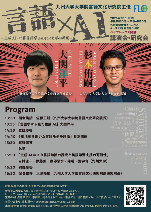 | イベント詳細 | 「言語学から見た生成AI」大関洋平(東京大学大学院総合文化研究科准教授) 「脳活動を用いた言語モデル評価」杉本侑嗣(大阪大学大学院人文学研究科講師) 「生成AIのメタ言語知識の探究と英語学習支援の可能性」吉村理一ほか(九州大学) |