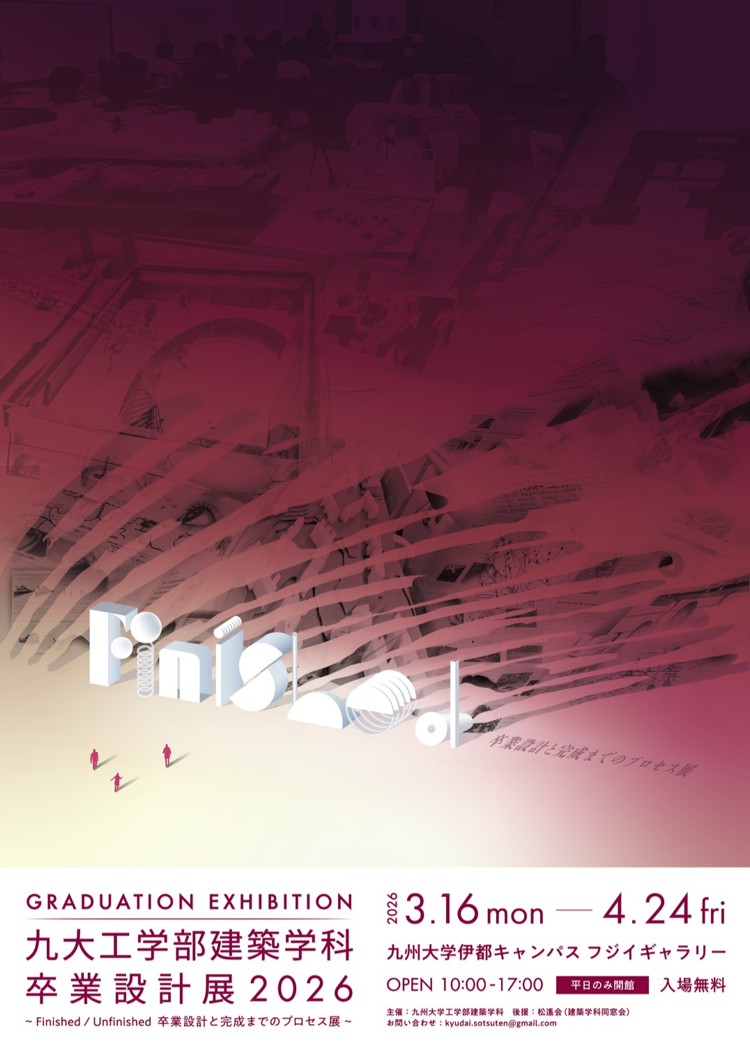 | イベント詳細 | 卒業設計とは、 建築学科の四年生が学生生活の集大成として取り組む、 学部教育の中で培ってきた思考や知識や技術など全てを導入して全力で自分の考えを自由に表現する一生に一度の機会です。 単なる建築物の設計にとどまらず、 人間・社会・都市・環境といった多様な観点から、 鋭い問題提起や創造的な提案を行います。 今年度は15名の学生が取り組み、 それぞれの試行錯誤の果てに力強い作品を生み出しました。15人が辿り着いた「建築の形」「制作を終えて」「終わりのその先」をぜひご覧ください。 |