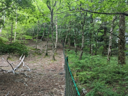 九州大学宮崎演習林(宮崎県椎葉村)の森林内に設置されたシカ防除柵(防鹿柵)の様子。柵外(画面左側)に対し、柵内(画面右側)では下層植生が保全されていることが分かります。