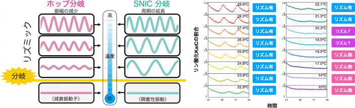 図2:体内時計は冷やすと振り子になる パラメータを変えてリズムが消失するとき2つのパターンが存在する。1つはホップ分岐、もう1つはSNIC分岐と呼ばれており、振幅が変化するのか周期が変化するのかという違いが存在する。KaiCリン酸化リズムは温度を減少させると20℃付近でホップ分岐がおこる。(Murayama et al. PNAS 2017から転載)