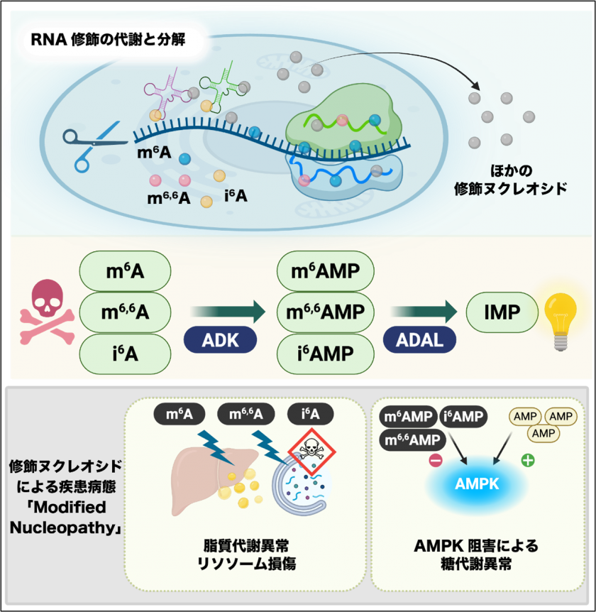 東北大学 加齢医学研究所の小川 亜希子助教(当時、現所属は薬学研究科准教授)、魏 范研教授、生命科学研究科の田口 友彦教授、医学系研究科の中澤 徹教授らは、九州大学 生体防御医学研究所の渡部 聡准教授、稲葉 謙次教授、農学研究院の有澤 美枝子教授、熊本大学 生命資源研究・支援センターの荒木 喜美教授、生物環境農学国際研究センターのアレン イールン ツァイ助教、澤 進一郎教授らとの共同研究、およびライプツィヒ大学やハーバード大学などとの国際共同研究により、修飾ヌクレオシドのうち、m6A、m6,6A、i6Aが毒性を持ち、酵素ADKとADALによって無毒なIMPへ代謝されるという経路を発見しました。この経路が破綻すると修飾ヌクレオシドやその中間代謝物が蓄積して糖代謝や脂質代謝の異常が生じ、さらにはリソソームなどの細胞小器官(注4)の機能不全が起こることが毒性の原因であることを同定しました。