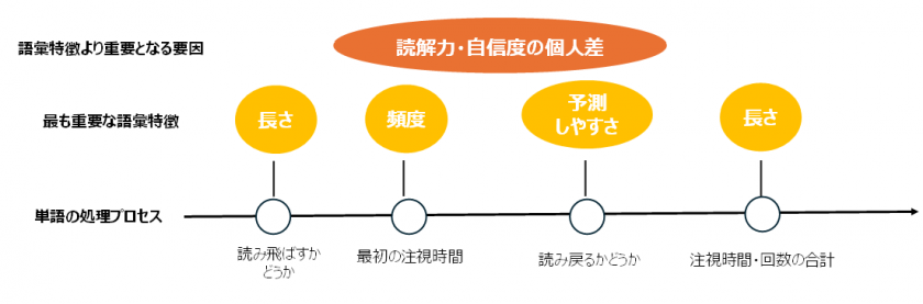 図2 本研究結果の概要。下段は英文読解中の単語の処理プロセスに応じた視線計測データの指標を、中段はそれぞれの視線計測データ指標において最も重要となる語彙特徴を示す。上段は語彙特徴よりも重要となりうる要因。