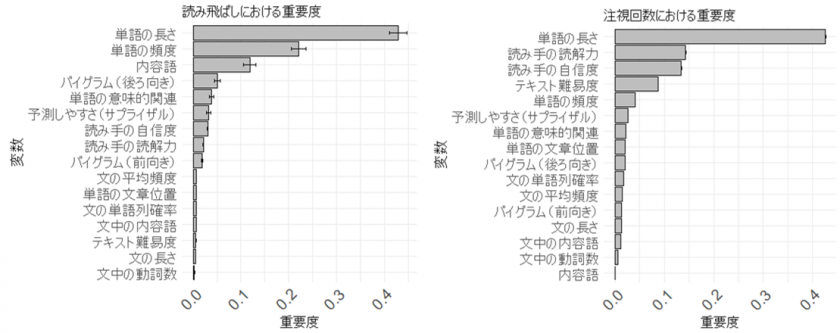本研究では、日本語を母語とする大学生・大学院生の英文読解中の視線計測データベースを用い、読解中の単語処理における、単語の長さ、頻度、予測しやすさの重要度を機械学習によって検討しました。これらの語彙特徴の他、英文読解力や自信度などの個人差要因、テキスト全体の難易度なども変数に加えて分析した結果、読み飛ばしの有無や合計の処理時間においては単語の長さが最も重要な要因でしたが、初期段階の処理(最初に単語を見た時の処理時間)や読み戻りについては、単語の頻度や予測可能性が重要となることが示されました。また、語彙特徴よりも個人差要因が重要となる場合もありました。