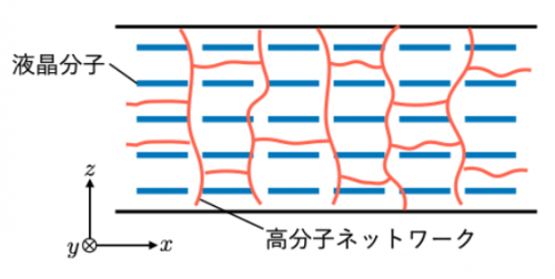 高分子の細かい網目構造の中に液晶を閉じ込めると、「高分子ネットワーク液晶」ができます(図)。この材料は、電圧で透明と不透明を切り替えるスマートガラスや、高速応答のディスプレイなどへの応用が実現されてきました。しかしこれまでの研究は、主に材料化学として静的な性質に注目しており、電圧を加えたときに生じる流れの構造や電流など、動的な物理現象は十分に理解されていませんでした。こうした動的な現象の解明は、新しい液晶応用の可能性を広げることが期待されています。それだけでなく、液晶を「小さな流体実験室」として利用することで、他分野の現象を理解する手がかりにもなり得ます。