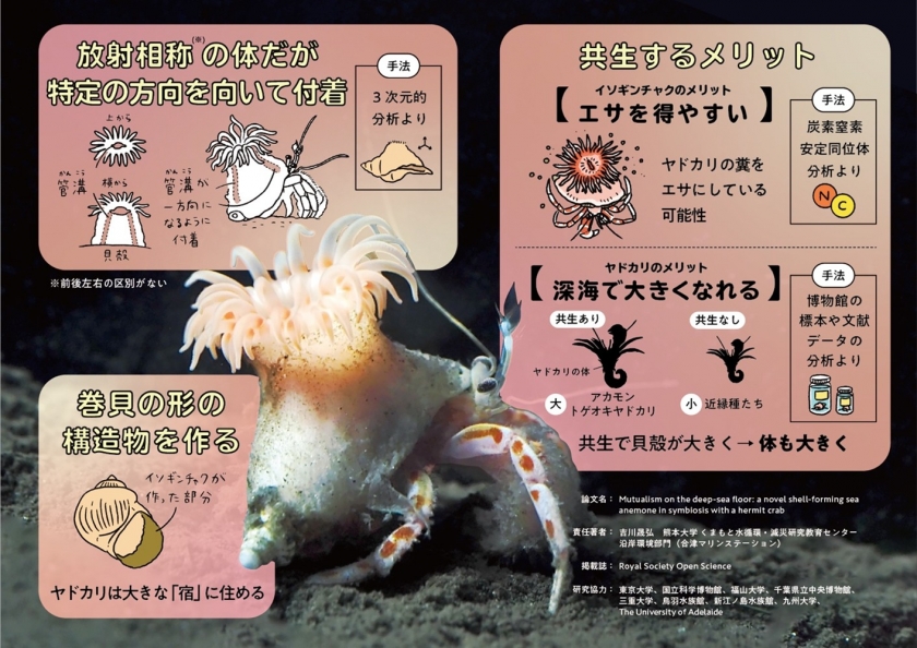 熊本大学くまもと水循環・減災研究教育センター沿岸環境部門(合津マリンステーション)の吉川准教授(理学部併任)(研究当時の所属:国立科学博物館, 鹿児島大学, 東京大学)、福山大学の泉講師、千葉県立中央博物館の柳主任上席研究員らを中心とする研究チームは、日本沿岸の太平洋側(三重県の熊野灘沖および静岡県の駿河湾沖)の深海からヤドカリが使う貝殻の上で暮らし、自身の分泌物でヤドカリの「宿」(注2)を拡張するイソギンチャクを採集しました。