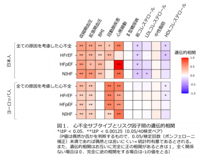 千葉大学大学院医学研究院 伊藤薫教授(理化学研究所生命医科学研究センター チームディレクター)、理化学研究所生命医科学研究センター 円山信之リサーチアソシエイト(研究当時)、九州大学大学院医学研究院 二宮利治教授、東京大学大学院医学系研究科 小室一成特任教授(国際医療福祉大学大学院教授)、東京大学医科学研究所附属ヒトゲノム解析センターシークエンス技術開発分野の松田浩一特任教授(同大学大学院新領域創成科学研究科メディカル情報生命専攻クリニカルシークエンス分野教授)らの研究グループは、日本人と欧州人の患者を対象に、心不全のタイプ別に異なる遺伝的な特徴を解明し、心不全が起こるメカニズムに集団ごとの違いがあることを明らかにしました。加えて、解析の結果から構築された心不全のなりやすさを点数化した「多遺伝子リスクスコア」や、心筋症の原因遺伝子である「TTN」変異のバイオマーカーを調べることで、心不全の進み方や予後を推定することが可能であることを発見しました。この成果は、心不全の精密な診断や治療薬開発につながることが期待されます。