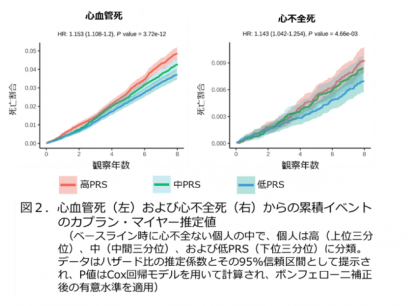 ・ さらに研究グループは、心不全発症や死亡リスクを予測する「多遺伝子リスクスコア(PRS)注3)」を独自に開発しました。日本人集団に最適化されたこのスコアは高い精度を示し、高リスク者の早期発見や死亡リスクの層別化が可能となりました(図2)。PRSが高い人は、若くして心不全を発症するリスクが高く、さらに診断時にはまだ心不全でない人でも、将来的な死亡リスクが高いことが分かりました。