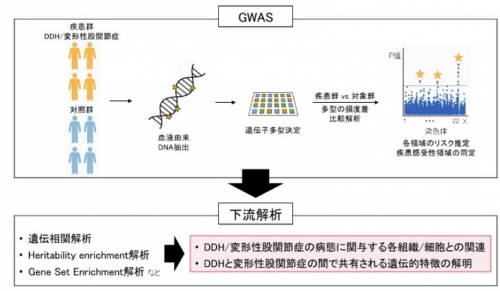 今回、共同研究グループは、合計で1,085人の日本人DDH患者と、770人のイギリス人DDH患者の両ゲノムデータを利用して、DDHとしては世界最大規模のGWASメタ解析[3]やサブグループ解析[4]を行い、合計9個の疾患感受性領域(うち7個は新規)を同定しました。さらに、OA GWAS国際メタ解析の公開データを用いてOAとDDHのメタ解析や相関解析を行い、両者で共有された遺伝因子が存在する一方で、異なる遺伝的基盤が存在することを明らかにしました。
