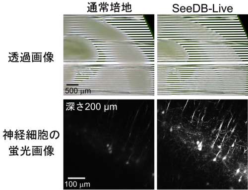 アルブミンを用いた透明化試薬SeeDB-Liveにより、取り出した脳組織や生きたマウスの脳を非侵襲的に透明化し、組織深部における微細構造や神経活動の観察が可能になりました。本成果は、これまで困難だった組織深部における生体機能の計測を可能にし、神経科学や発生生物学など広く生命科学分野の発展に寄与することが期待されます。