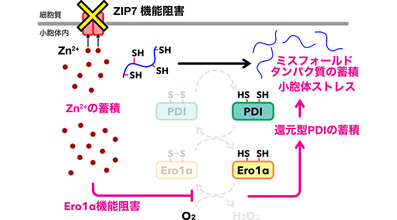 小胞体膜に局在するZIP7を阻害すると小胞体内に亜鉛イオン(Zn2+)が蓄積する。この過剰な亜鉛はEro1αの働きを直接阻害し、PDIの再酸化が妨げられる。その結果、新規合成された分泌タンパク質にジスルフィド結合が導入されず、ミスフォールドタンパク質(※4)が蓄積することで小胞体ストレスが生じることが明らかとなった。