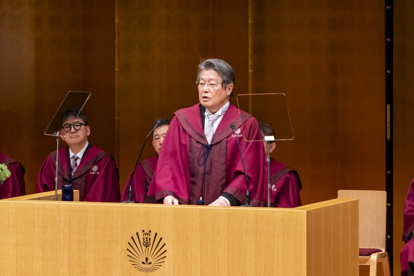 石橋総長から各課程の代表者に学位記を授与した後、告辞を行いました。告辞では、本学の卒業生であり、スーダンにおける医療支援活動を通じ、本学とスーダンの架け橋となられている川原尚行先生や、本学の国内外に設立されている19団体の同窓会に触れ、「九州大学は卒業生の皆さんとのつながりを大事にしています。これから皆さんが新しい場所で活動していく中で、改めて学びたいと思った時、あるいは新たな目標に挑戦したいと考えた時には、ぜひ九州大学に戻ってきてください。これらのネットワークも大いに活用して、今後も九州大学とのつながりや社会における活動を充実したものにしてください。」と温かい激励の言葉が贈られました。