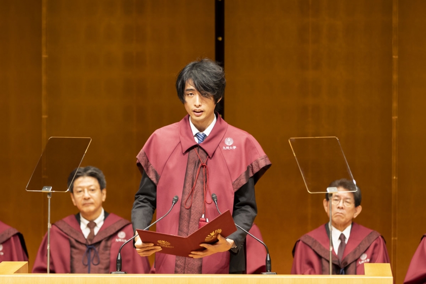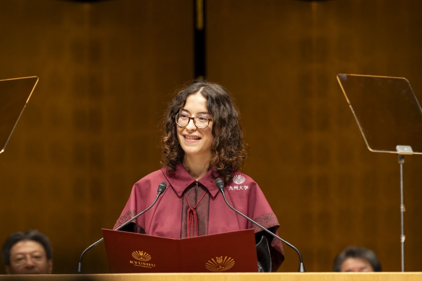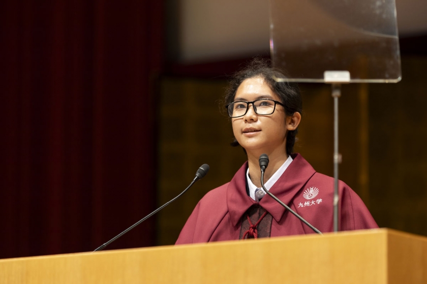 続いて、新入生を代表して、工学部のTRAN THAI GIAIさん(ベトナム)、大学院システム情報科学府博士後期課程のFAN WENXUANさん(中国)、外国人短期留学プログラム(JTW)のOCÉANE LACLAUさん(フランス)から挨拶があり、歓迎への感謝の意や、学生生活への抱負や決意を交えた意欲的なスピーチが行われ、国際色に溢れる式は盛会のうちに幕を閉じました。