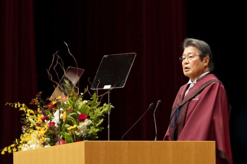 式典では、まず石橋総長から告辞があり、スーダンを中心にアフリカで活躍されている本学の卒業生・客員教授の川原尚行先生の医療課題への貢献に触れながら、「自分の専攻分野だけでなく、他の幅広い学問分野を学ぶことや、多様な人々と交流することにも積極的にチャレンジしてください。そのチャレンジを通して得られる多様な視点や考え方が、新たな発見や価値を見出すことに繋がります。」と激励の言葉が贈られました。