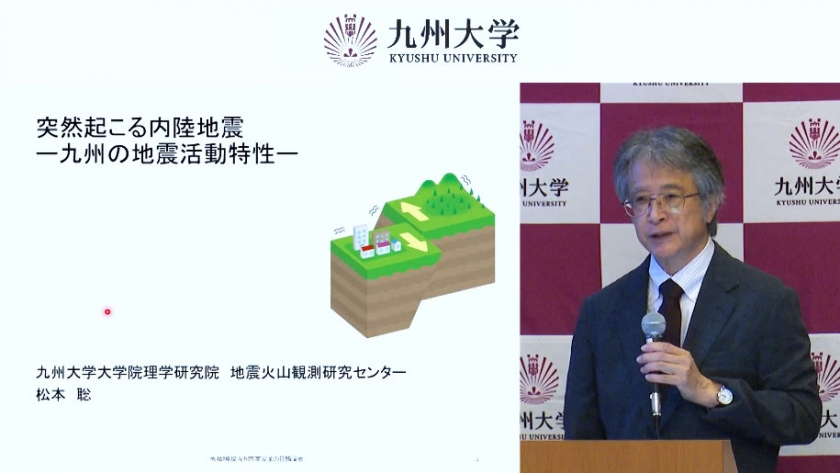 また、松本 聡 九州大学 大学院理学研究院 教授/附属地震火山観測研究センター長から、「突然起こる内陸地震 -九州の地震活動特性-」と題し、九州ではこれからも大きな地震が起こる可能性があるため、個人から社会までいろいろなスケールで備えが必要であること、突然に備えるイメージや配慮が減災につながること等についてご講演いただきました。