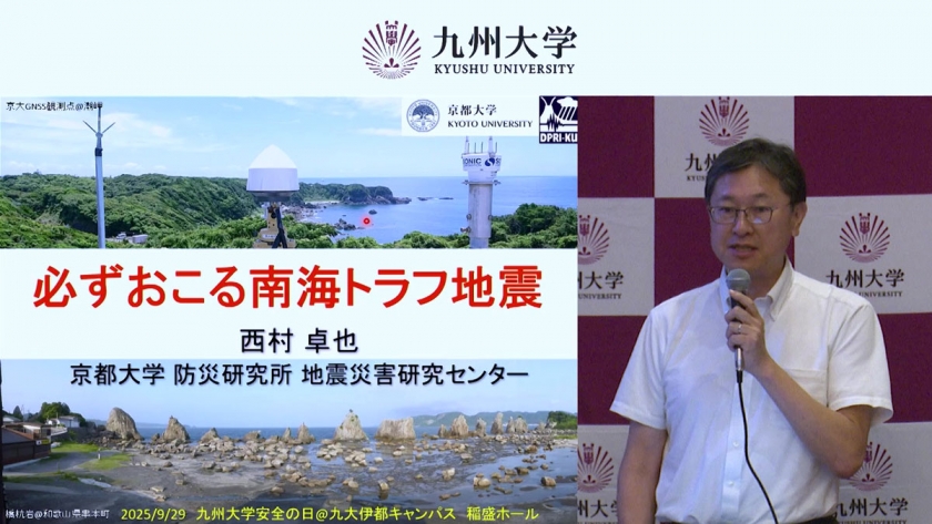 「九州大学安全の日」の取組みの一環として、2017年度から毎年、本学の教職員及び学生を対象に安全の日講演会を開催しています。本年度は「巨大地震に対する知識と心構え」をテーマに、会場とライブ配信によるハイブリッド形式で実施しました。