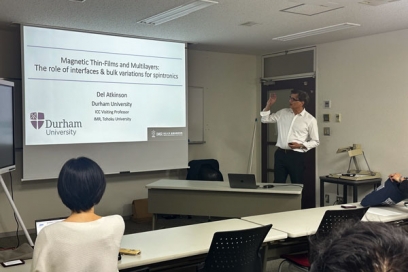 その後、システム情報科学研究院においてAtkinson 教授によるゲストレクチャーが行われ、同教授が専門とする多層膜スピントロニクスとナノ磁性について、最新の研究成果が具体的な実験例とともに紹介され、参加した教員・学生と活発な質疑応答も交わされました。