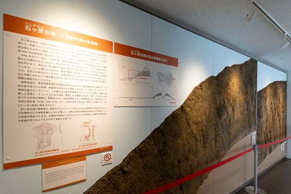 文化財の半数以上が現状保存されましたが、敷地中央に位置した石ヶ原古墳はやむを得ず削平。その記憶継承のため学内に「石ヶ原古墳跡展望展示室」が設置されています。