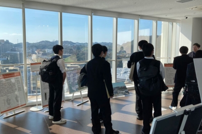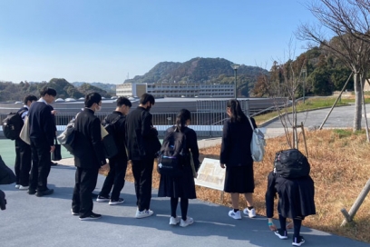 また、フジイギャラリーでのイベントの前には、伊都キャンパスのイースト1号館9階の石ケ原古墳跡展望展示室を案内しました。展望展示室からキャンパス全景を見ながらその概要を説明しつつ、キャンパス内で見つかった遺跡群についても紹介しました。