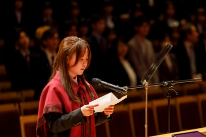 続いて、新入生総代の紅彩美さん(教育学部)が、「私達は本学教育の趣旨を体して、自立の精神を重んじ、学術を極めるとともに、自ら人格の陶冶に努め、社会の期待に沿うことを誓います」と誓詞を朗読しました。