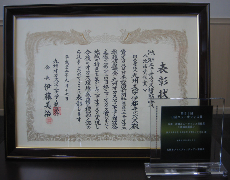 平成22年9月17日(金),日本経済新聞社・社団法人ニューオフィス推進協議会及び九州オフィスファニチュアー懇話会主催の「第23回日経ニューオフィス賞」において,本学伊都キャンパスが【九州・沖縄ニューオフィス奨励賞】<地域貢献賞>を受賞しました。 今回の受賞は,知の拠点としての広大なキャンパスが,美しい環境とあたたかい地域住民に支えられており,大学と地域と住民が一体となった効果的な機能性をもつキャンパスデザインに仕上がっていることが,高く評価されたものです。 日経ニューオフィス賞は,「ニューオフィス」づくりの普及・促進を図ることを目的とし,創意と工夫をこらしたオフィスを表彰するものです。その他詳細については,社団法人ニューオフィス推進協議会のWebサイトをご覧ください。