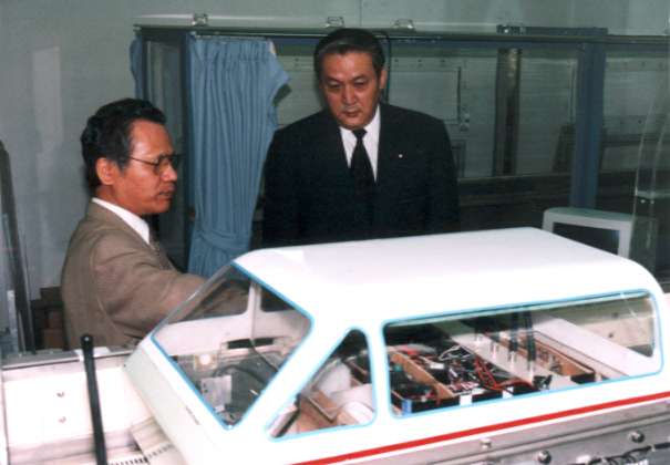 Minister Ohta visited a laboratory which is now working on developing the amphibious train 'Marine Express'. Dean Ozaki, Professor Ohta of the Graduate School of Engineering, and Professor Yoshida of the Graduate School of Information Science and Electrical Engineering, explained the progress of this research and showed him model trains.
