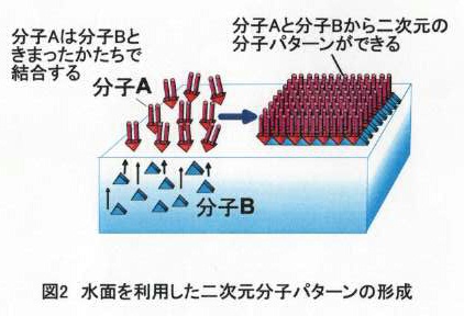 その後数百に及ぶ二分子膜形成化合物を合成して世に送り出すとともに,その特性を生化学、材料化学などの様々な分野に応用・展開してきました。界面での分子認識と二次元分子格子の形成分子の組織化を水―空気の二次元界面で行えば,二次元の分子パターン(図2)ができることを,最先端技術である原子間力顕微鏡によって明らかにしました。このように,分子と分子の相互作用を厳密にコントロールすることによって,分子組織の構造を任意にデザインすることができ,分子建築学ともいえる学問分野がひらけつつあります。