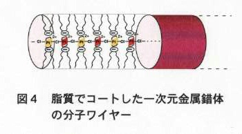 - 自己組織化の概念を,有機分子と無機分子の組み合わせに展開し,一次元金属錯体の周囲を有機分子集合体でコートした,分子ワイヤー(図4)を開発しました。
