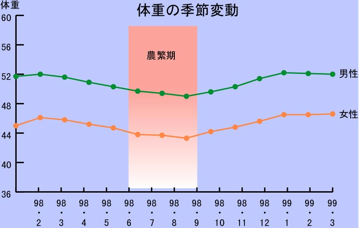左下図は,ネパールの丘陵地農民の1年間の体重の変動(20〜74歳の男性: 87名,女性:94名)を追跡したものです。農繁期の6〜9月には農閑期に比べて 体重が平均3.4kgも減少し,農閑期には戻っています。農繁期には食糧が少な く,労働量が増えるためです。このような季節変動は,体重だけではなく,血 液や血圧にも認められます。