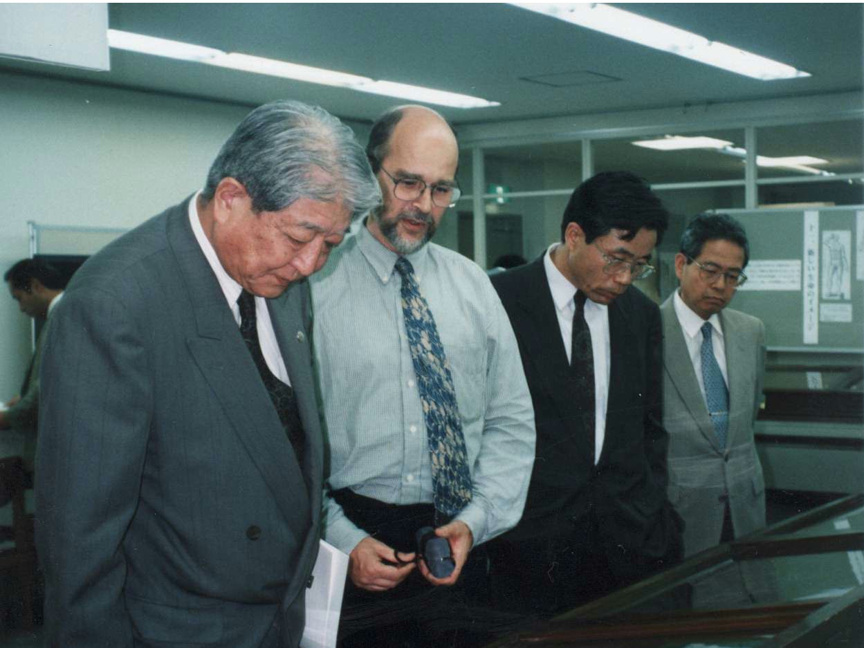 - 展観会場でミヒェル教授(左から二人目),有川附属図書館長(右から二人目)から説明を受ける杉岡総長